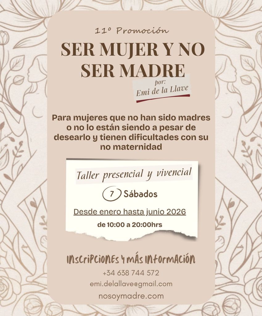 Vuelve de nuevo el taller vivencial y presencial en Madrid SER MUJER Y NO SER MADRE que empezará en el mes de Enero y terminará en Junio de 2026. Una oportunidad única para trabajar en grupo el asunto de la no maternidad entre mujeres no madres. Un conjunto de 6 módulos de un sábado al mes de 10:00 a 20:00h en grupo donde se trabajará y se experimentará con dinámicas todos los asuntos que conlleva este tema en las mujeres. ¡¡ANIMAROS!!! Es un trabajo maravilloso.