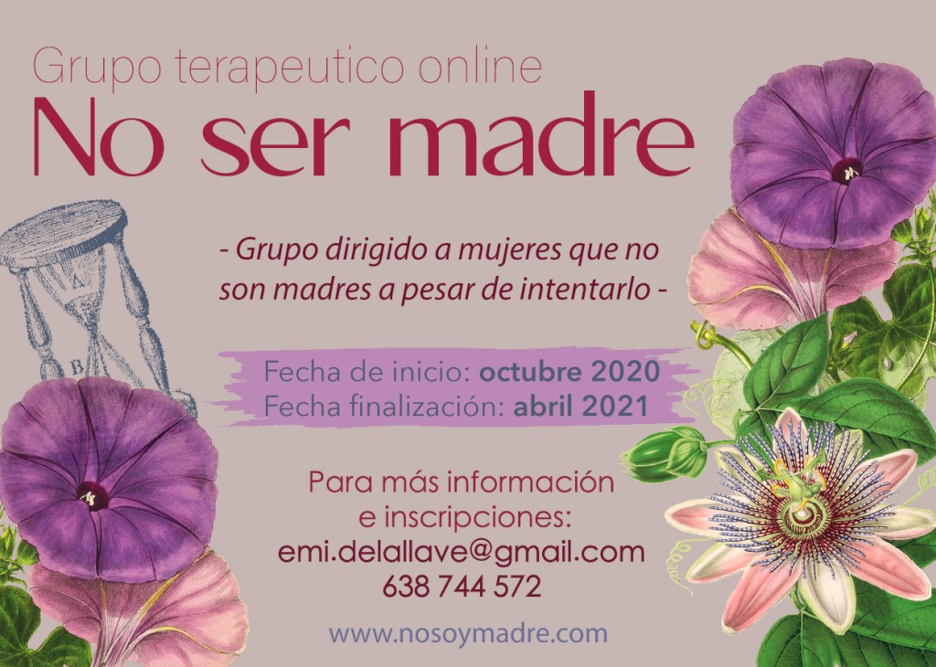 El taller SER MUJER Y NO SER MADRE será sustituido este año debido a la pandemia, por este grupo de terapia online, para todas las mujeres que deseen trabajar de manera terpapeútica sus conflictos emocionales y dificultades ante el hecho de no ser madres. Para inscripciones y más información es necesario contactar vía email a emi.delallave@gmail.com ó llamando al teléfono 638 744 572. Empieza el martes dia 13 de Octubre de 19:00 a 21:00h quincenalmente.